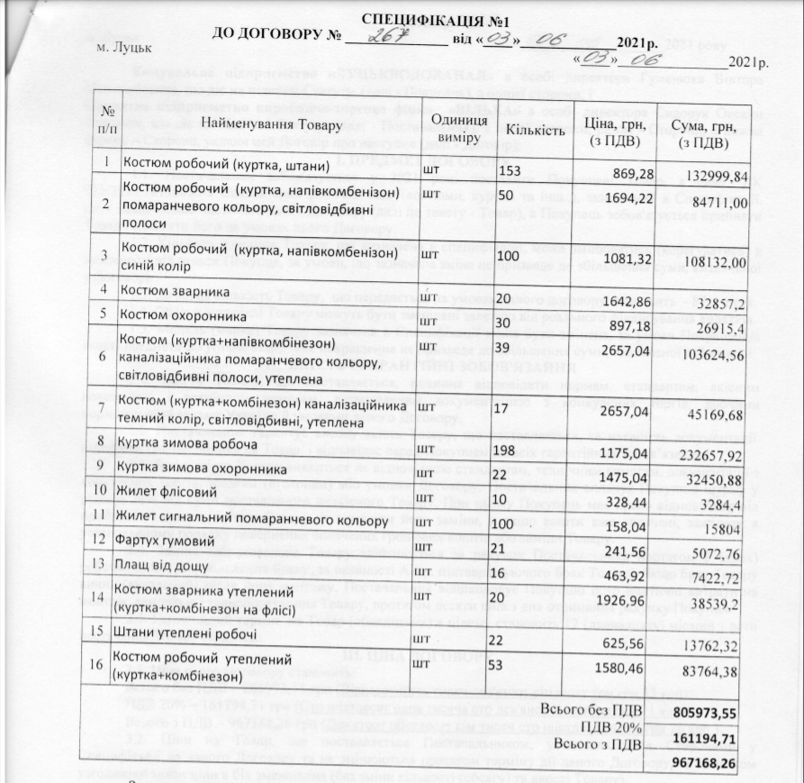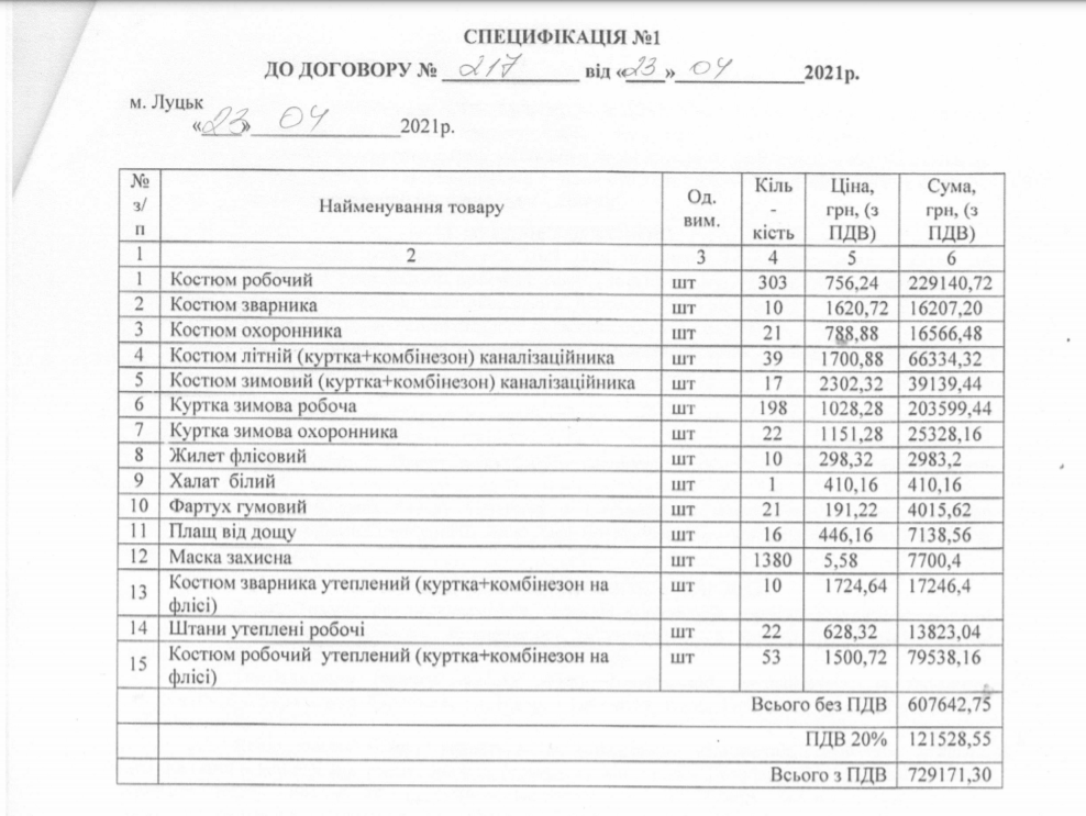Згідно з договором, «Луцькводоканал» замовив комбінезони, штани, куртки, сигнальні жилети, плащі від дощу та інше. Загалом – 871 одиницю товару.
