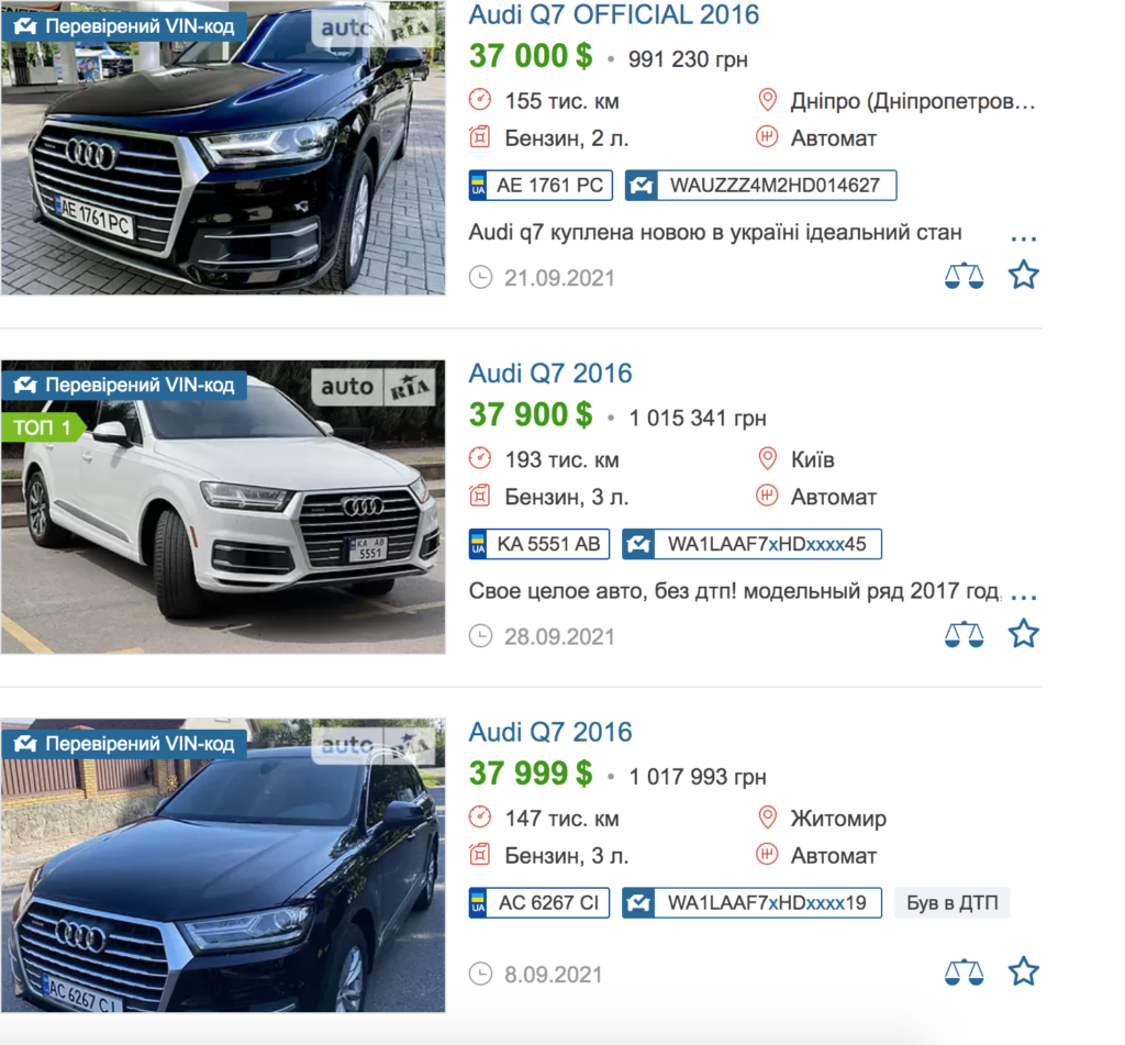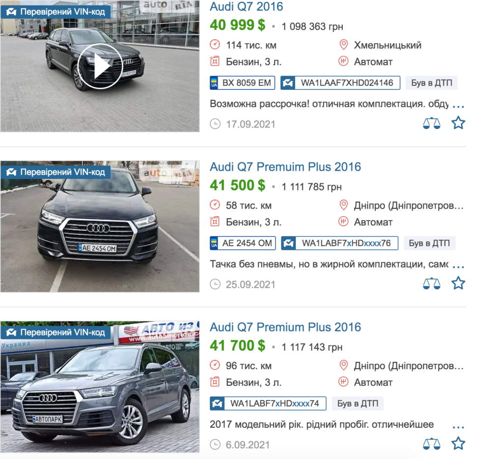 Однак на сайтах із продажу автівок вартість «Audi Q7» 2016-го року випуску коливається від 37 до 60 тисяч доларів.