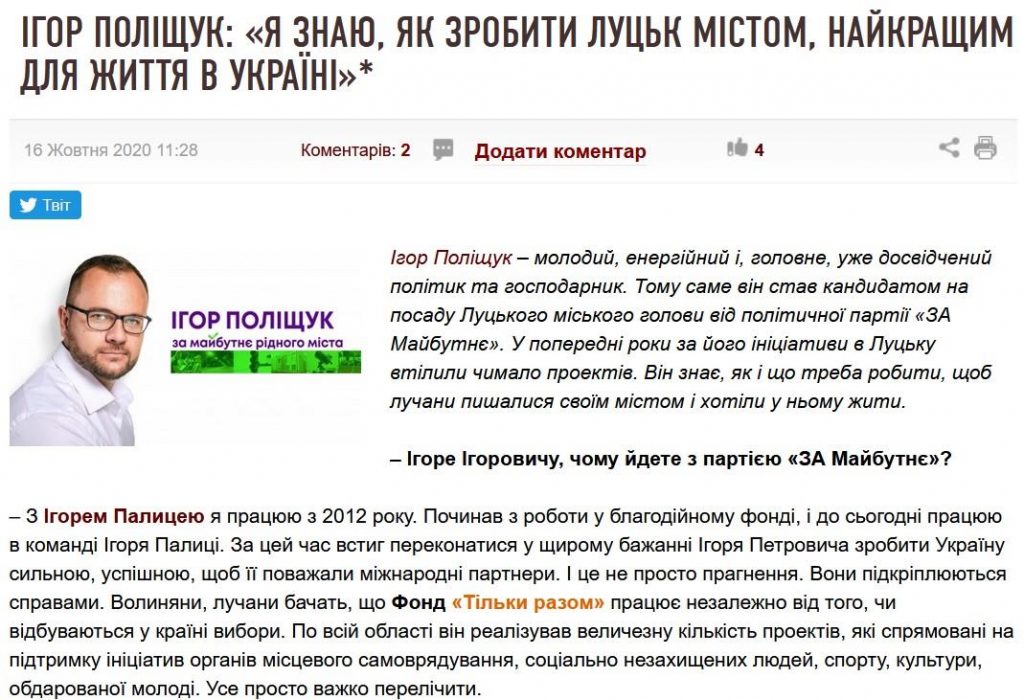 Частина таких текстів присвячена кандидату в мери Луцька Ігорю Поліщуку. Текст із назвою «Ігор Поліщук: «Я знаю, як зробити Луцьк містом, найкращим для життя в Україні»* позначений лише зірочкою. Створений редакцією ІА «Волинські новини» матеріал зосереджений на тому, щоб створити виключно позитивне враження про політика.