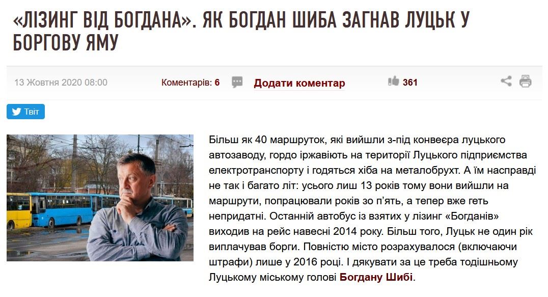 Також ІА «Волинські новини» опублікували матеріал із ознаками замовності проти кандидата на посаду Луцького міського голови Богдана Шиби – «Лізинг від Богдана».Як Богдан Шиба загнав Луцьк у боргову яму. Головна проблема подібних матеріалів: абсолютна відсутність балансу та використання здогадок і емоційного нагнітання там, де авторам не вистачає доказів чи аргументів. Іноді така «чорнуха» взагалі збудована виключно на здогадках та безпідставних емоційних судженнях.
