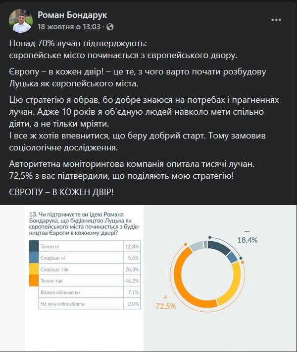Напередодні виборів кандидати та медіа частіше «грішать» публікуванням сумнівних чи цілком фейкових соцопитувань. Так, за період моніторингу кандидат в мери Луцька Роман Бондарук похвалився тим, що «понад 70% лучан підтверджують: європейське місто починається з європейського двору». При цьому у публікації на своїй сторінці він робить висновок на підставі того, що «авторитетна моніторингова компанія опитала тисячі лучан».