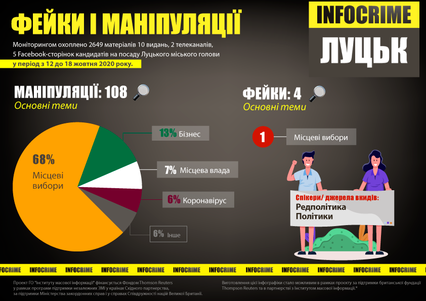 Чим ближче до виборів, тим більше з’явилось маніпуляцій у медіа Волині. Ключовою темою у промоніторених волинських медіа стала тема місцевих виборів. Аж 68% маніпуляцій на тему місцевих виборів у період моніторингу виявили фактчекери проєкту «INFOCRIME Луцьк» cеред 2649 промоніторених матеріалів.