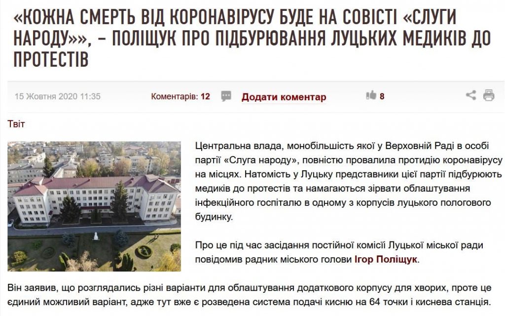 На сайті «Волинські новини» цього тижня опублікували маніпулятивний текст із заголовком «Кожна смерть від коронавірусу буде на совісті «Слуги народу», – Поліщук про підбурювання луцьких медиків до протестів».