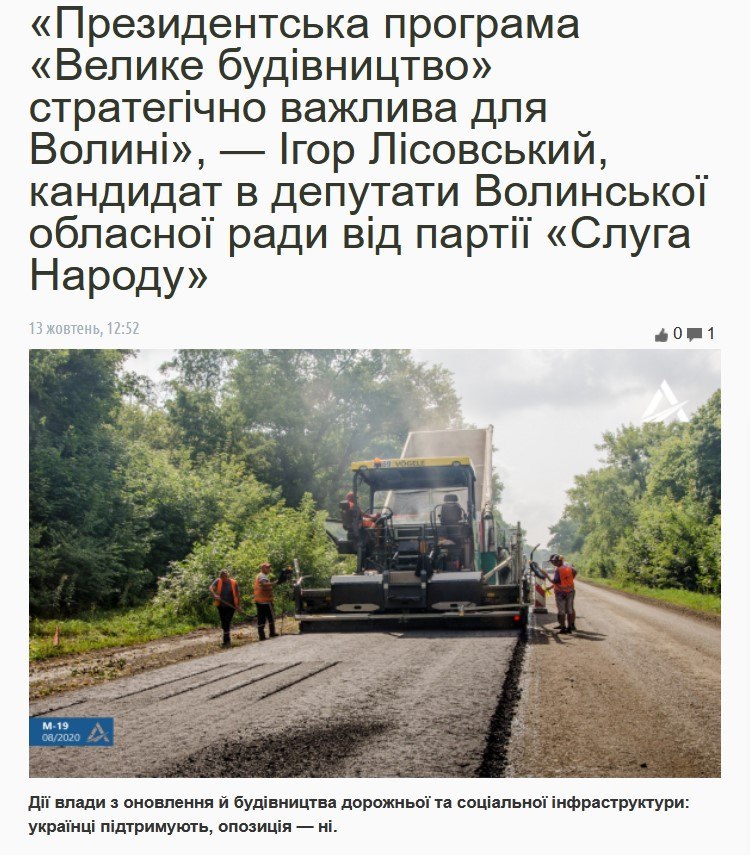 На сайті «Волинь24» є матеріал із ознаками замовності про «Велике будівництво» – «Президентська програма «Велике будівництво» стратегічно важлива для Волині», — Ігор Лісовський, кандидат в депутати Волинської обласної ради від партії «Слуга Народу»».