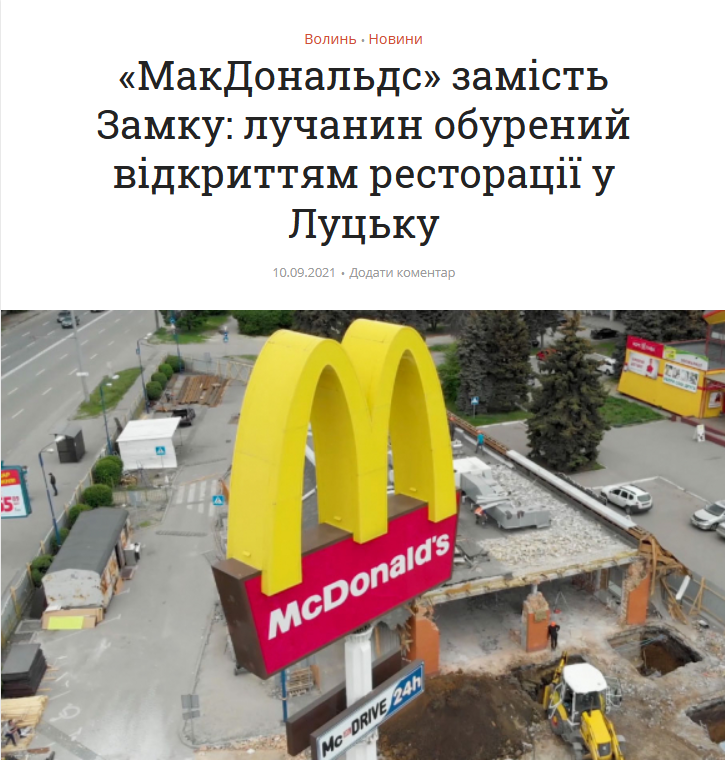 Одразу два сайти «Волинь24» та «Волинь#Infa» опублікували маніпулятивні новини з однаковими заголовками: «МакДональдс» замість Замку: лучанин обурений відкриттям ресторації у Луцьку. Новини створені на основі публікацій із соцмереж, а у заголовках є явне перебільшення. Один користувач соцмереж нарікає у одній з груп у Facebook, що лучани настільки чекають відкриття «МакДональдсу» (відкриття відбулось 11 вересня — авт.) у Луцьку, що вважають його більш потрібним за Луцький замок. Однак, з думки одного лучанина взагалі не варто робити новину. Також Замок Любарта взагалі недоречно порівнювати із закладом швидкого харчування.