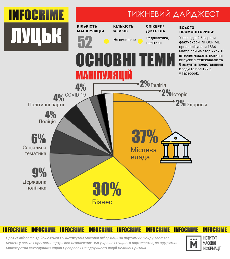 Такі дані отримали в результаті щотижневого моніторингу інформаційного простору командою проєкту Infocrime Lutsk за підтримки британського фонду Thompson Reuters, у партнерстві з Інститутом масової інформації.