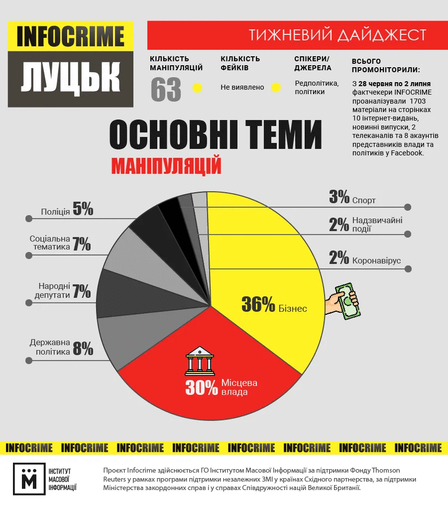 У період з 28 червня по 2 липня фактчекери INFOCRIME проаналізували 1703 матеріали на сторінках 10 інтернет-видань, новинні випуски 2 телеканалів та стрічку 8 акаунтів представників влади та політиків у Fасebook.