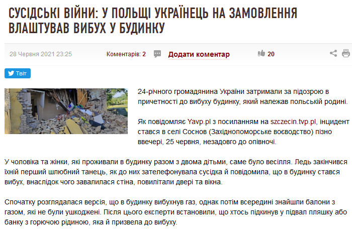 Так, у заголовку «Сусідські війни: у Польщі українець на замовлення влаштував вибух у будинку» на сайті ІА «Волинські новини» зустрічаємо приклад мови ворожнечі та маніпуляцію. Читачі можуть цей заголовок сприйняти неоднозначно, адже редакція написала сама про «сусідські війни», а також на сайті акцентували увагу на національності.