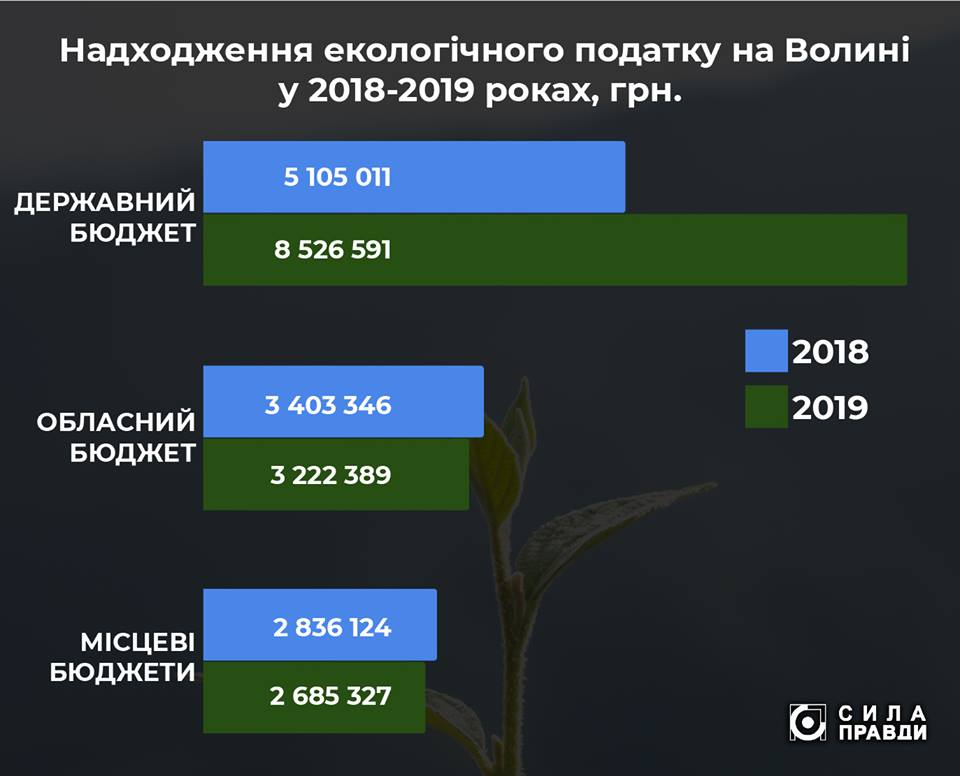 Розпорядником екологічних коштів державного бюджету є Міністерство захисту довкілля та природних ресурсів України, де акумулюються такі ж надходження із різних областей. Їх виділяють регіонам у рамках певних програм за зверненнями самих регіонів. У 2018-му році до державного бюджету від волинських платників екологічного податку надійшло понад 5 мільйонів гривень, а у 2019-му — понад 8 мільйонів. Така різниця, за словами заступника начальника управління екології та природних ресурсів Волинської ОДА Вікторії Тимощук, полягає у збільшенні кількості дозволів у цьому році.
