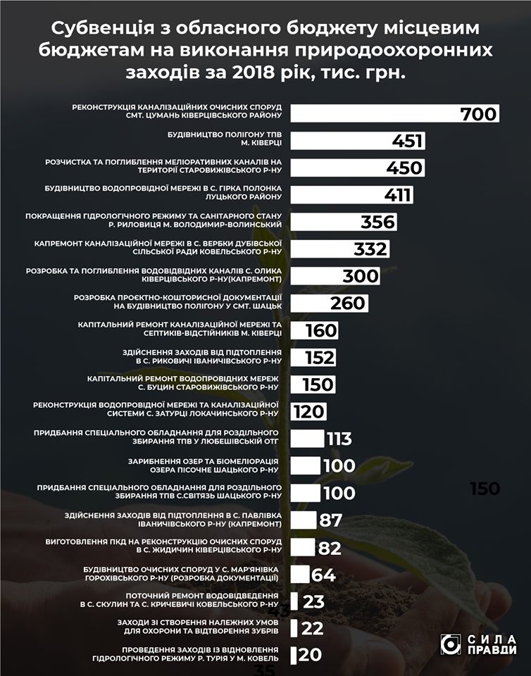 Загалом у 2018-му році на природоохоронні заходи для районів виділили понад 4 мільйони гривень. За ці кошти місцеві ради проводили ремонти каналізаційних мереж, будівництво водопровідних мереж, покращували санітарні стани річок і навіть створювали умови для охорони та відтворення зубрів.