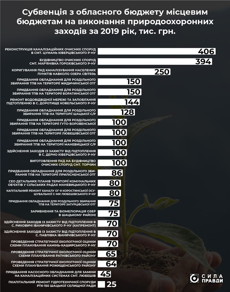 У 2019-му році для районів виділили майже три мільйони гривень екологічних коштів. Їх використали на будівництво очисних споруд, ремонти каналів та водовідвідних мереж, придбання обладнання для роздільного збору сміття, стратегічні екологічні оцінки та зарибнення озер.