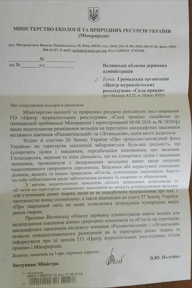 Міністерство екології та природних ресурсів розглянуло лист-звернення Центру журналістських розслідувань «Сила правди» щодо розміщення вольєрів для диких тварин у волинських заказниках та попросило Волинську облдержадміністрацію вжити заходів для збереження природи.
