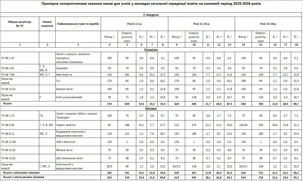 Серед документів Одарчук подала і приклад чотиритижневого зимового меню для дітей різного віку. Зокрема, пропонує на один зі сніданків салат з капусти та горошку, скрамбл, мак енд чіз (макарони з сиром), хліб та банани.
