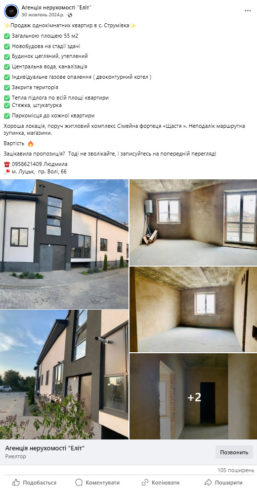 Квартири із будинку, що став об’єктом уваги правоохоронців, активно продають. Ще з літа 2024 року агенція нерухомості «Elit» у соціальних мережах регулярно публікує оголошення, про продаж однокімнатних квартир площею по 55 квадратних метрів у будинку, що «перебуває на стадії здачі».