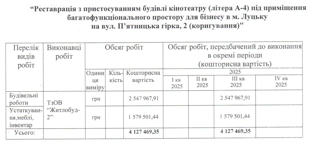 Про дофінансування робіт в колишньому кінотеатрі Луцька відомо з системи публічних закупівель «Prozorro».