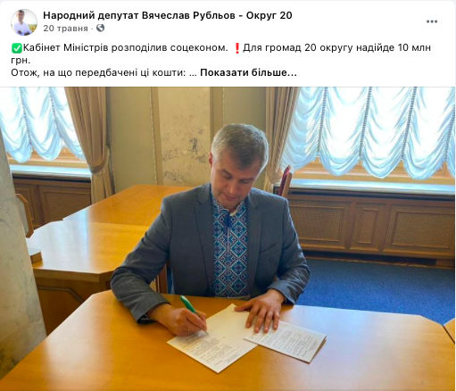 20 травня 2021 року народний депутат Вячеслав Рубльов на своїй офіційній сторінці у Facebook розмістив допис про те, що Кабінет Міністрів розподілив «соцеконом» таким чином, що на округ №20 надійде 10 млн грн. Також нардеп оприлюднив статті витрат субвенції.