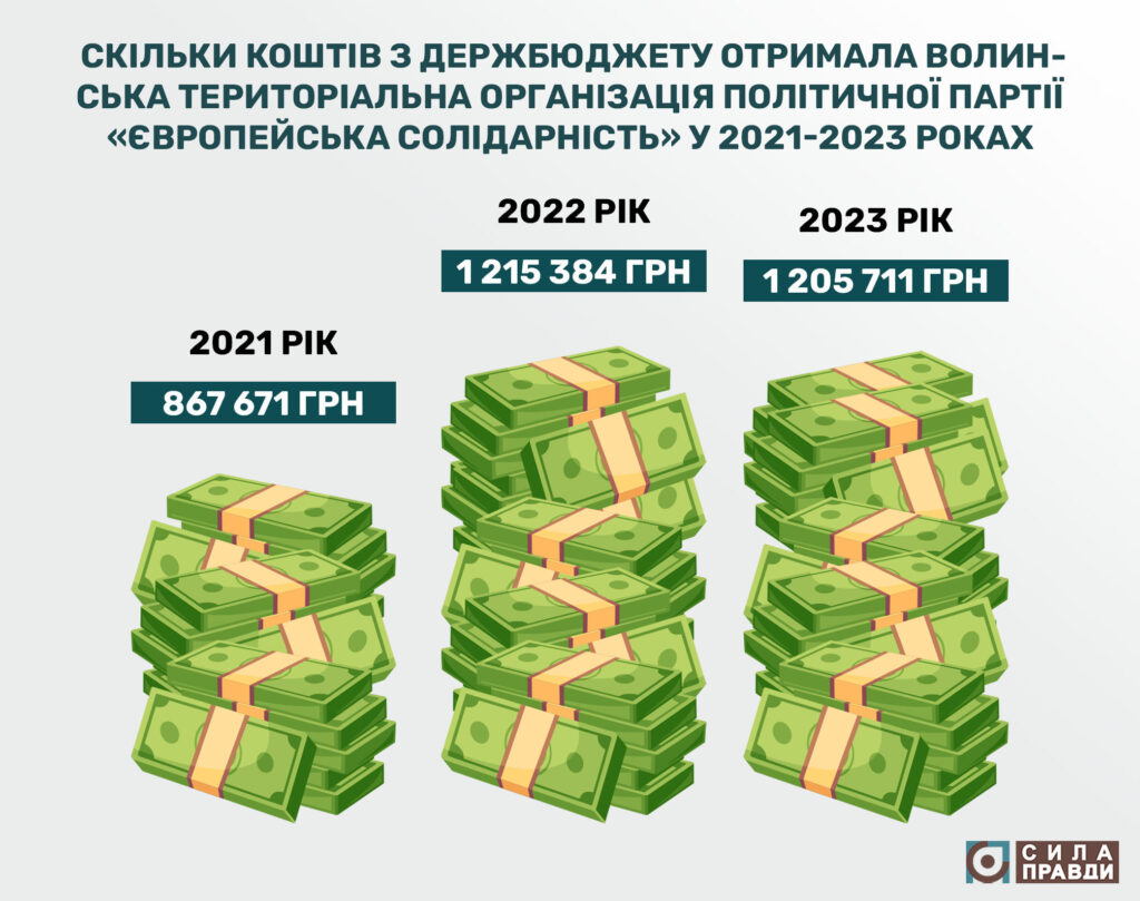 Центр журналістських розслідувань «Сила правди» проаналізував фінансові звіти Волинської територіальної організації політичної партії «Європейська солідарність» за 2021, 2022 та 2023 роки.