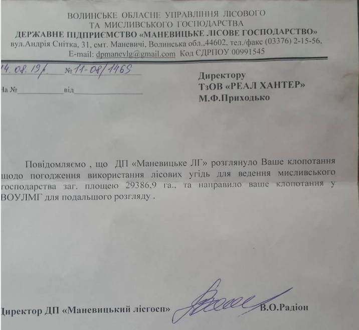 Чоловік каже, коли довідалися про можливий розвиток подій, то зареєстрували власне мисливське підприємство «Реал Хантер» і офіційно заявили про намір вести мисливське господарство на угіддях лісгоспу. Звернулися за погодженням до ДП «Маневицьке лісове господарство».