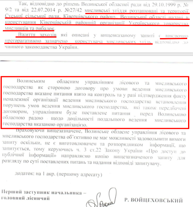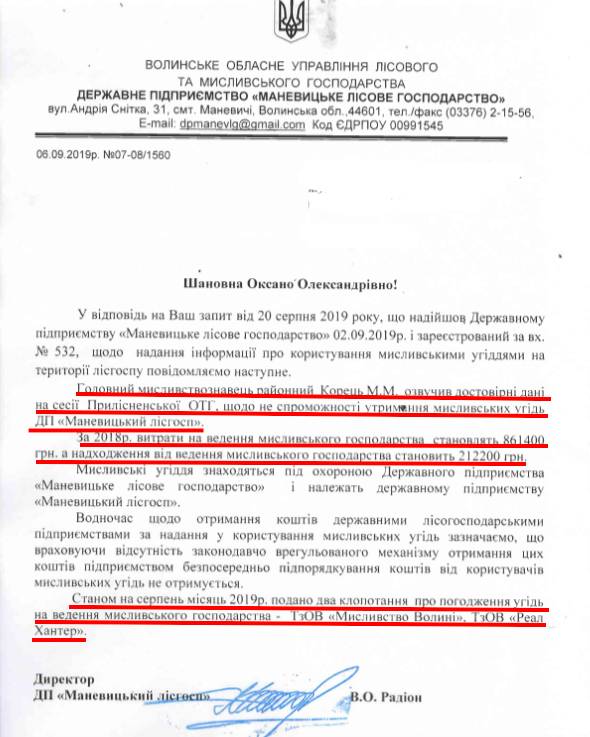 − На сесію будемо виносити питання про передачу мисливських угідь чотирьом фірмам. І в Маневицькому районі в тому числі. А ті, хто до вас звернувся, швидше за все браконьєри. Я, як директор «Волиньприродресурсу» знаю для чого їм ці угіддя. Це ліцензовані площі під бурштин.