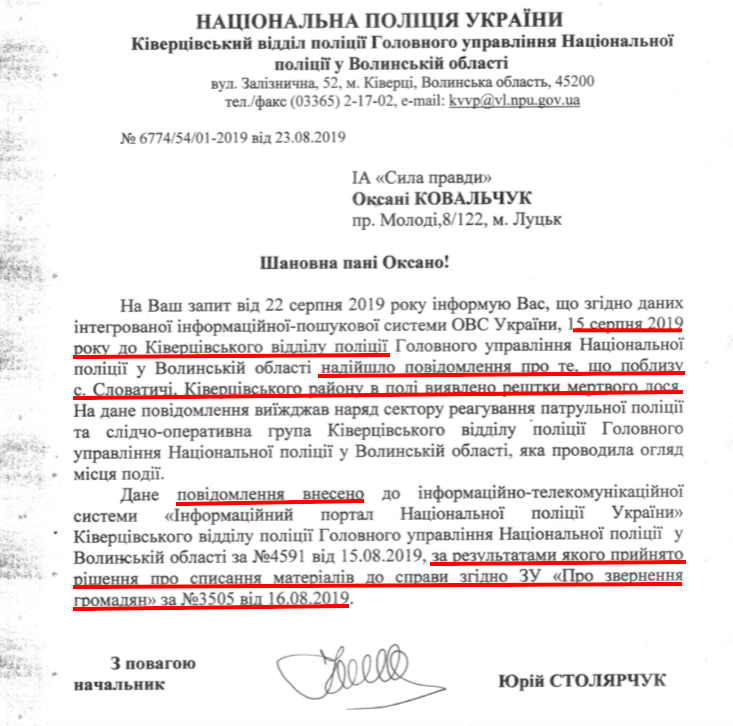 Та за два тижні рештки тварини розтягнули собаки, а пояснень у свідка так ніхто і не брав. Зателефонувавши повторно начальнику сектору мисливства, почули лише байдуже: «Сфотографуйте ті рештки і скиньте мені координати». Тож вирішили вдатися до рішучіших дій. Викликали поліцію.