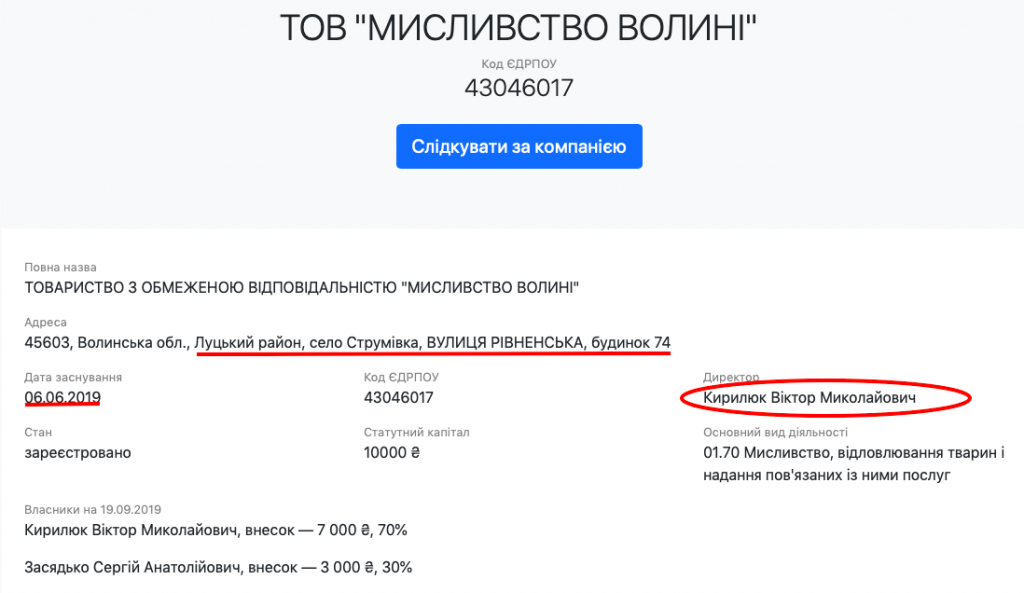 У селі Струмівка на Рівненській, 74 зареєстровано з десяток фірм, а ще там знаходиться сервісний центр МВС. На прохідній кажуть, що жодних мисливських організацій там немає. З аналітичної бази «YouControl» довідуємося про ще одне «щасливе» підприємство за цієї адресою, ТОВ «Техноклас Плюс», якому у 2017 році розпорядженням голови ОДА надали в користування терміном на 49 років лісову ділянку в Мощанському лісництві ДП «Цуманське ЛГ». Власне там і виріс згодом лісовий ресторан «Явір», де можна скуштувати страви з дичини.