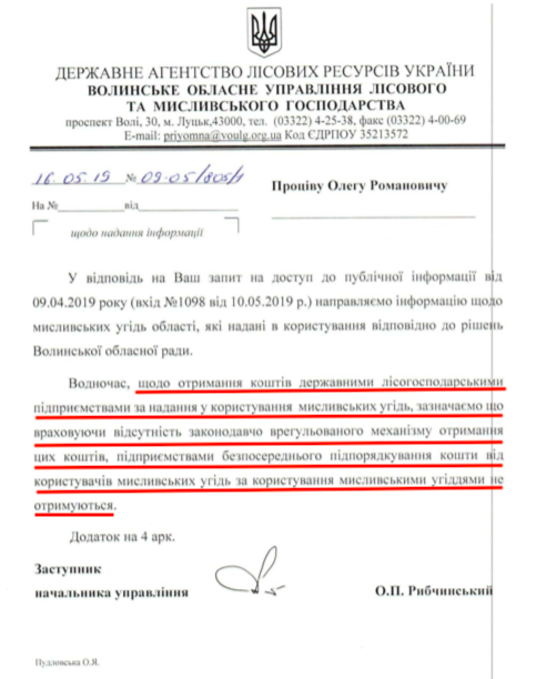 Кілька місяців тому український мисливствознавець, кандидат наук з Івано-Франківщини Олег Проців звернувся у прокуратуру Волинської області із заявою про невиконання статті 24 ЗУ «Про мисливське господарство та полювання» (відсутність отримання плати за наданий в користування державний лісовий фонд під ведення мисливського господарства іншим користувачам мисливських угідь) підприємствами Волинського ОУЛМГ.