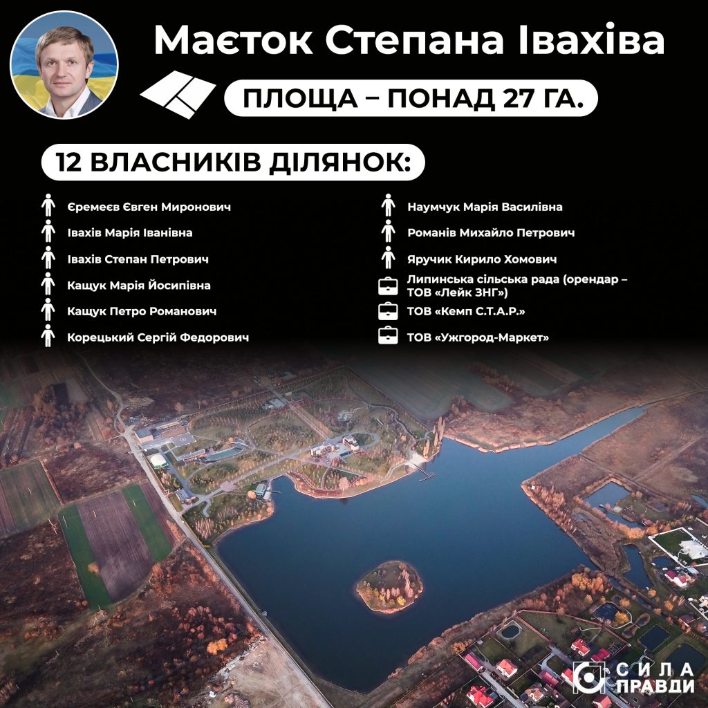18,3 гектара землі під водним плесом, гідроспорудою і прибережною смугою оцінили у 157 717 гривень. Договором встановлено, що щомісяця користувач повинен сплачувати до сільського бюджету 760 гривень, а використовувати заплаву для рибогосподарської діяльності і забезпечення відпочинку своїх працівників. Трохи більше, ніж через рік, у жовтні 2011-го, умови дещо відкоригували. Цікаво, що додаткову угоду до згаданого вище договору, яка закріпила ці зміни, підписувала вже не «Західна нафтова група», а Товариство з обмеженою відповідальністю «Лейк ЗНГ», засновником і бенефіціаром якого є Степан Івахів.