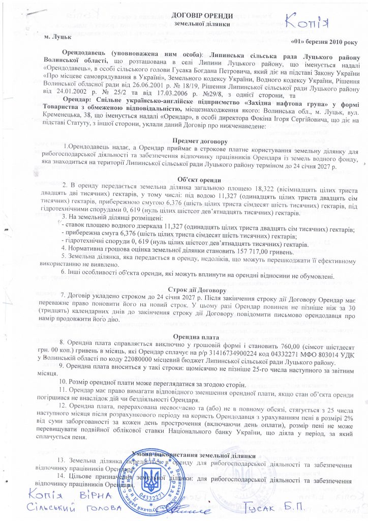 Отже, водойма перейшла у користування Степана Івахіва майже 10 років тому. Спільне українсько-англійське підприємство «Західна нафтова група» уклало договір оренди з Липинською сільською радою в особі чинного й досі голови Богдана Гусака у березні 2010-го.