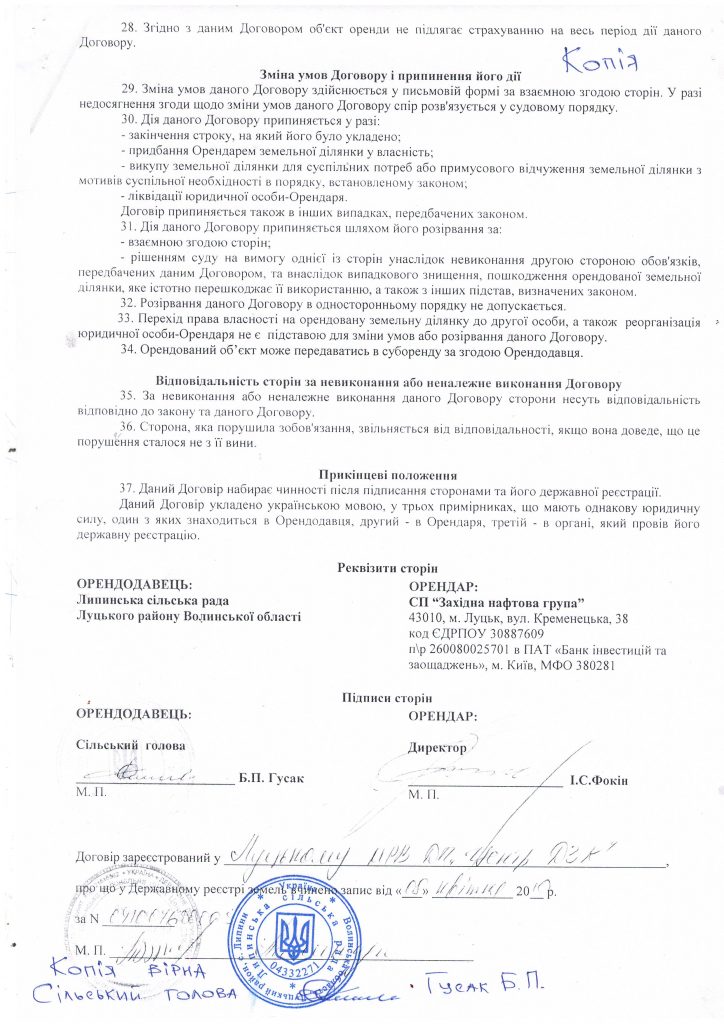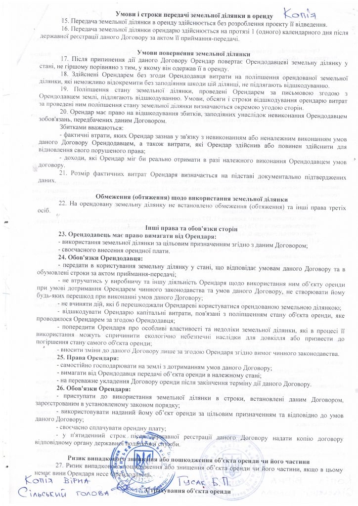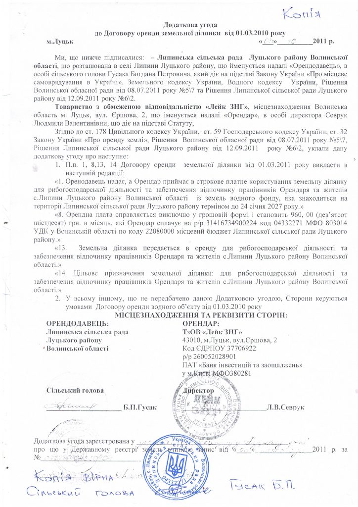 У документі прописали збільшення орендної плати на 200 грн., а також можливість жителів села Липини користуватися водоймою.