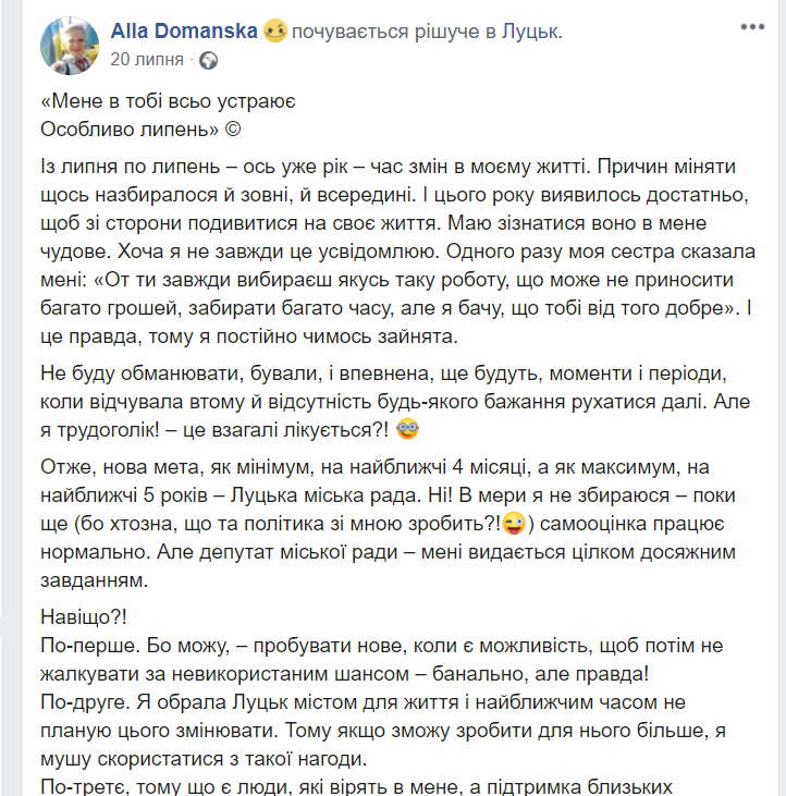 Чи не найпершими про бажання бути обраними до місцевих рад через платформу Facebook повідомили потенційні кандидати від «Європейської Солідарності». 20 липня Алла Доманська повідомила, що долучилася до команди та те, що балотуватиметься до складу Луцької міської ради. Згодом, інформацію про те, що вона змагатиметься за депутатське крісло прозвучала й в інтерв’ю Алли Доманської на платформі «Жінки — це 50% успіху України».