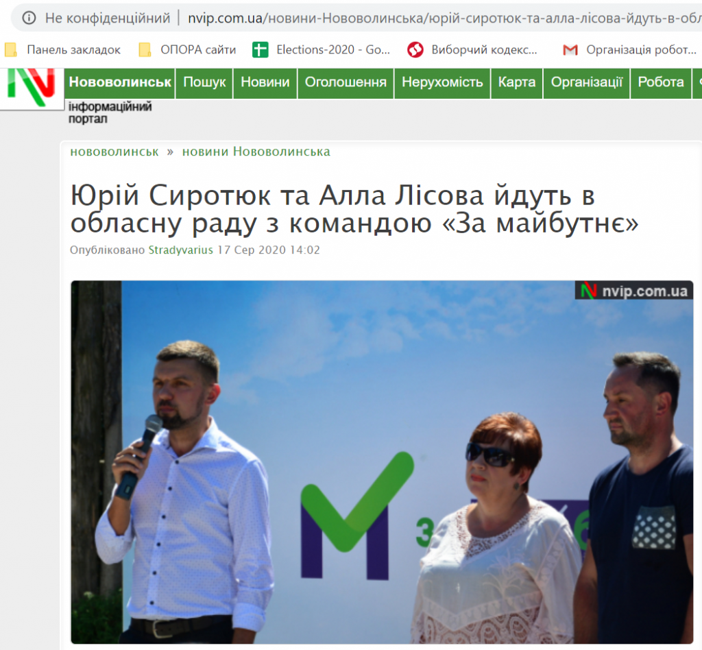 16 серпня видання «Нововолинський інформаційний портал» розмістило публікацію «У Нововолинську презентують команду «За Майбутнє». ОНЛАЙН». Вона містила відеострім із презентації команди від партії «За Майбутнє», що балотуватимуться до Нововолинської міської та Волинської обласної рад. 17 серпня це ж видання опублікувало новину «Юрій Сиротюк та Алла Лісова йдуть в обласну раду з командою «За майбутнє» із посиланням на вищевказану презентацію. Зауважимо також, що видання «БУГ» та Інформаційне агентство «Волинські Новини» опублікували повний список кандидатів від партії до міської ради Нововолинська.
