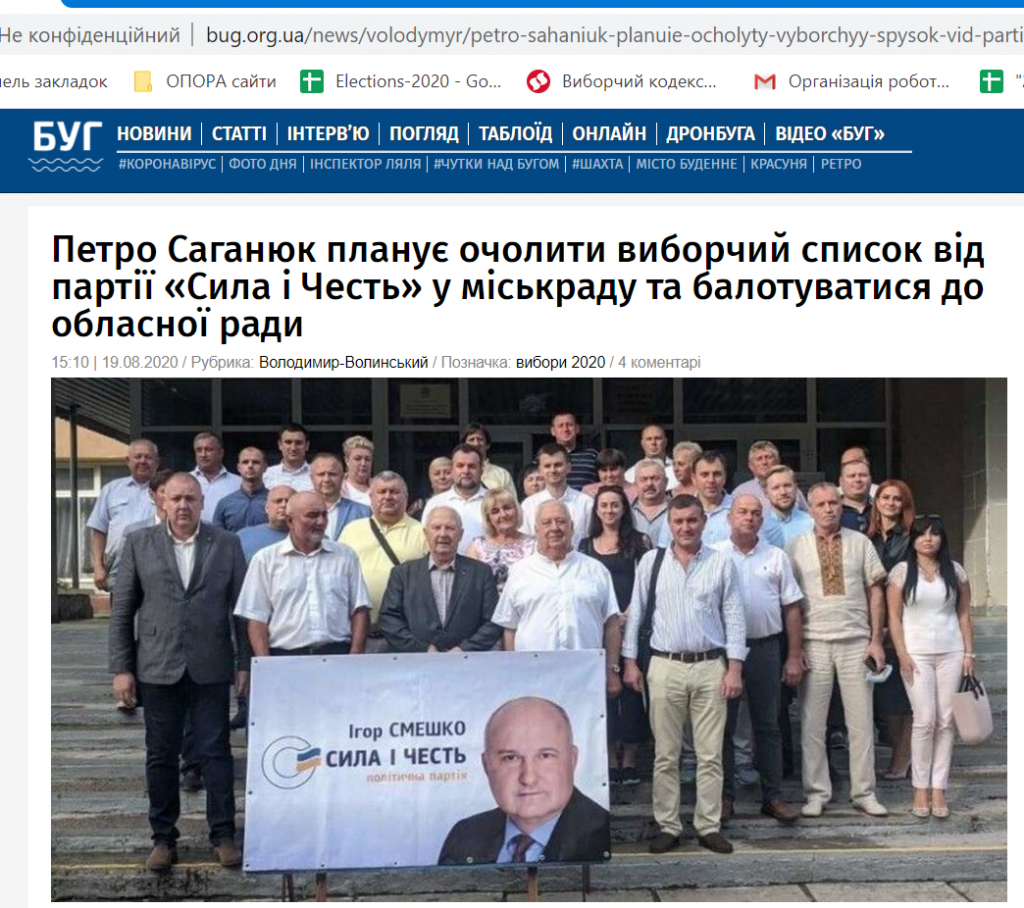 19 серпня ж дня видання «БУГ» та «Перший» повідомили, що список партії «Сила і Честь» до Володимир-Волинської міської ради очолить чинний мер Петро Саганюк, який також балотуватиметься й до обласної ради.