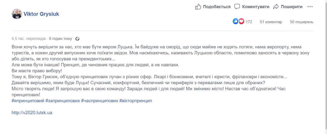 21 серпня голова ГО «Принцип» Віктор Грисюк у своєму Facebook повідомив, що збирає команду принципових лучан. У коментарях до посту він підтвердив, що балотуватиметься на пост Луцького міського голови.
