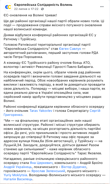 Щодо партій, то 22 липня на Facebook-сторінці «Європейська Солідарність. Волинь» з’явився допис щодо оновлення команди. У ньому, зокрема, йдеться про те, що попереду – місцеві вибори, тож партія має серйозний намір здобути представництво у місцевих радах Волині.