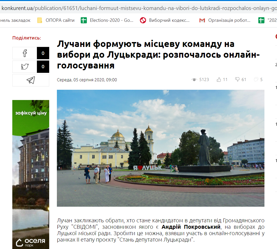 Окрім того, інформаційне агентство «Конкурент» та видання «ВолиньInfa» повідомили про ініціативу із вибору кандидатів у депутати Луцької міської ради від «Громадянського руху «СВІДОМІ». 5 серпня вони розмістили публікації під назвою «Лучани формують місцеву команду на вибори до Луцькради: розпочалось онлайн-голосування» та «Лучани можуть обрати хто піде в депутати Луцькради від команди Покровського» відповідно. Тут, зокрема, згадується лише лідер команди Андрій Покровський, а також розписаний алгоритм голосування та є посилання на сайт із відбором, де вже вказані конкретні потенційні кандидати.
