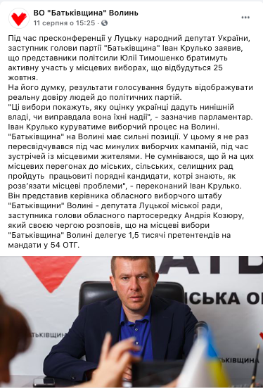 11 серпня видання «Волинь24» повідомило, що у Луцьку відбулася прес-конференція за участі заступника лідера ВО «Батьківщина», народного депутата Івана Крулька. У ході заходу повідомили, що партія висуватиме своїх кандидатів на виборах в усіх громадах. До слова, новина про те, що партія братиме участь у виборах у волинських громадах на Facebook-сторінці обласного осередку «Батьківщини» з’явилася наступного дня. Окрім того, 12 серпня про це написало інтернет-видання «БУГ».