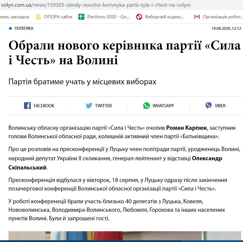 19 серпня інтернет-ресурс газети «Волинь» розмістив публікацію про обрання нового очільника волинського осередку партії «Сила і Честь». Ним став Роман Карпюк. У ході прес-конференції повідомили, що партія братиме участь у місцевих виборах.