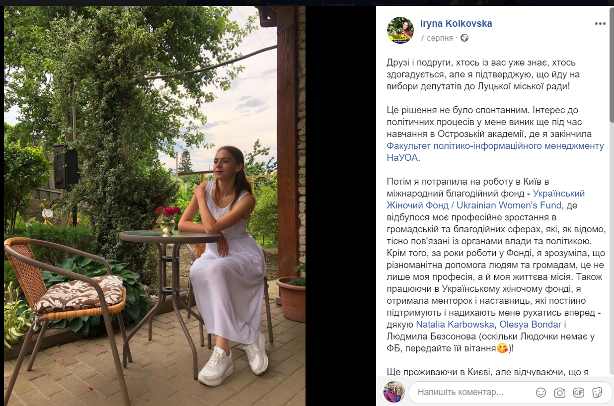Ще одна потенційна кандидатка від «Європейської Солідарності» Ірина Колковська написала про бажання балотуватися на своїй сторінці 7 серпня.