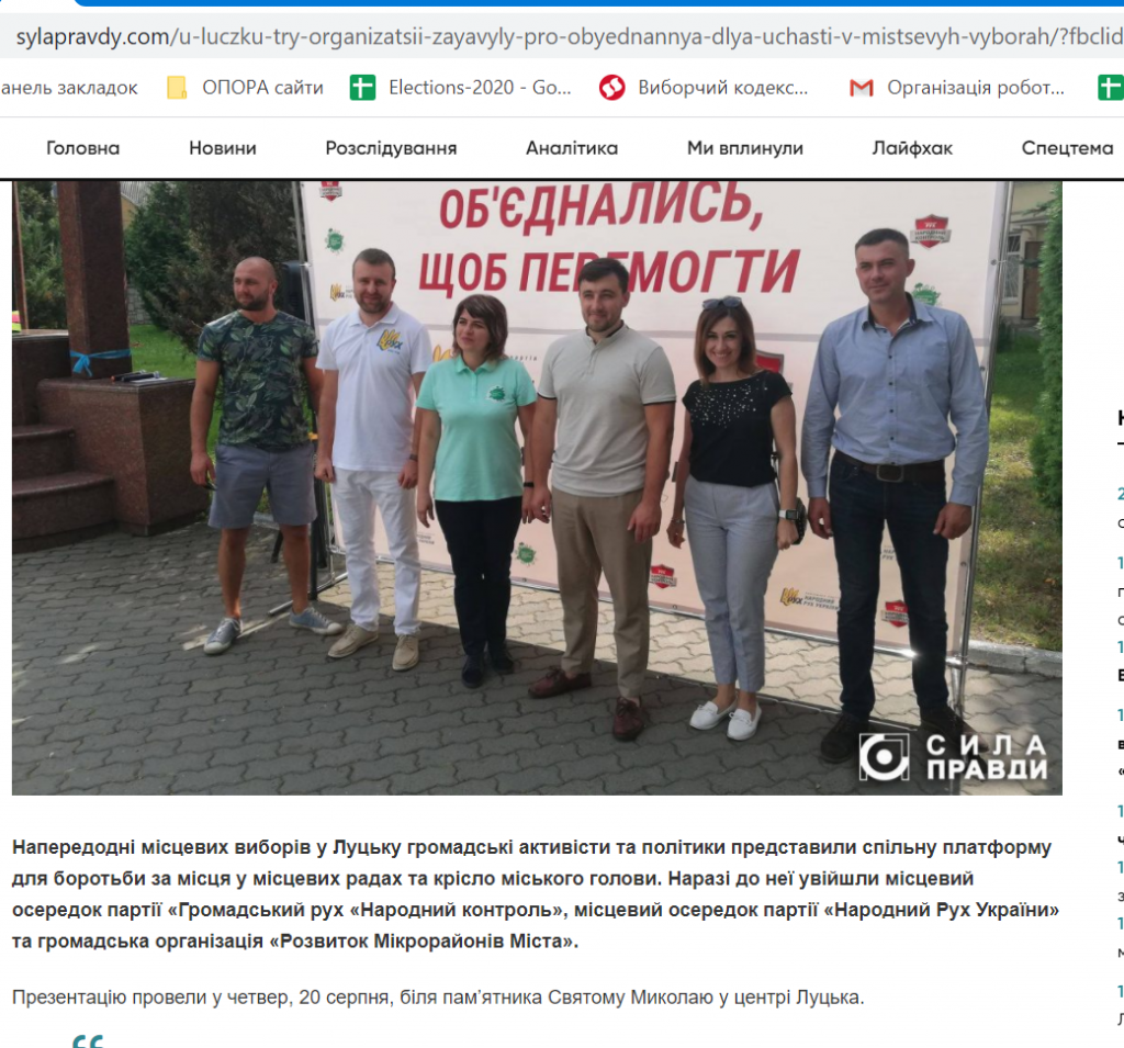 20 серпня також стало відомо про об’єднання місцевих осередків парій «Громадський рух «Народний контроль», «Народний Рух України» та громадської організації «Розвиток Мікрорайонів Міста» для спільної участі у виборах. Про це написали Центр журналістських розслідувань «Сила правди», інтернет-видання «Перший».