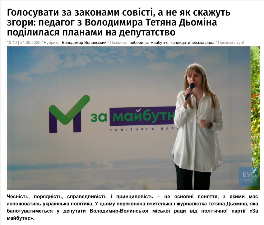21 серпня у виданні «БУГ» вийшов матеріал під назвою «Голосувати за законами совісті, а не як скажуть згори: педагог з Володимира Тетяна Дьоміна поділилася планами на депутатство». У ньому повідомляється про те, що вчителька і журналістка Тетяна Дьоміна має намір балотуватися до Володимир-Волинської міської ради від партії «За майбутнє».
