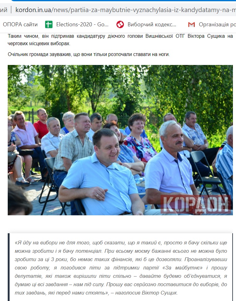 Того ж дня «Кордон» написав про те, що за посаду голови Вишнівської ОТГ знову змагатимуться її чинний голова Віктор Сущик. У матеріалі також є перелік осіб, які балотуватимуться на посади депутатів. Аналогічну новину розмістив «БУГ».