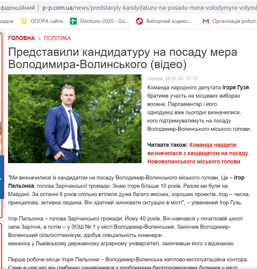 29 липня про свій намір балотуватися на виборах 25 жовтня на посаду міського голови Володимира-Волинського повідомив голова Зарічанської ОТГ Ігор Пальонка. Того ж дня цю інформацію розмістило видання «Під прицілом». Публікація під назвою «Представили кандидатуру на посаду мера Володимира-Волинського (відео)» містить відеоролик за участю нардепа, потенційного кандидата та починається із логотипу політичної партії «За майбутнє».