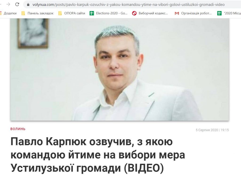 З серпня Павло Карпюк виклав ролик, у якому каже, що має намір балотуватися на посаду Устилузького міського голови. Тож 5 серпня видання «ВолиньUA» розмістило публікацію «Павло Карпюк озвучив, з якою командою йтиме на вибори мера Устилузької громади (ВІДЕО)». Журналісти посилаються на Facebook-сторінку потенційного кандидата. У публікації також розмістили відео, де він розповідає про свої цілі та команду.