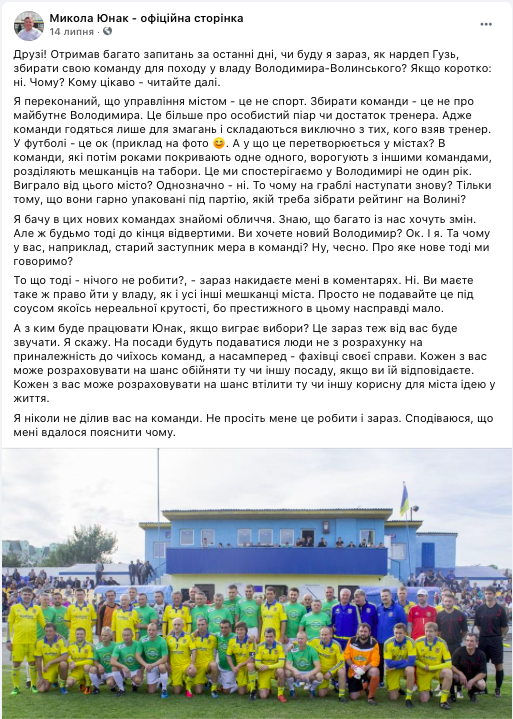 Повідомлення про намір балотуватися на посаду міського голови Володимира-Волинського з’явилося на сторінці «Микола Юнак – офіційна сторінка» 14 липня. Натомість лише 7 серпня інтернет-ресурс володимирської газети «Слово правди» розмістив публікацію «Точка зору: «Мерів міст обирають люди, а не призначає нардеп чи спонсор», – Микола ЮНАК». В інтерв’ю вказують, що він має намір балотуватися, тож потенційний кандидат, висловлює побажання виборцям та розповідає , що зробить у разі перемоги.
