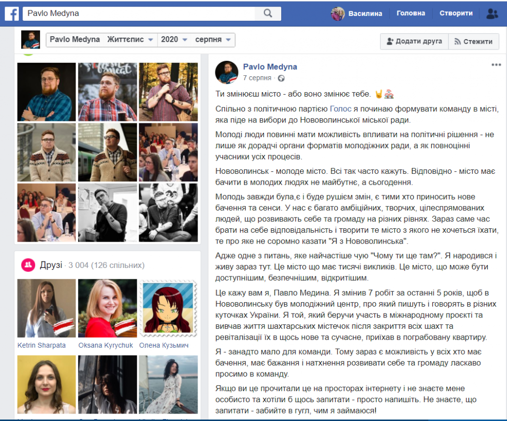 7 серпня про намір балотуватися до Нововолинської міськради заявив Павло Медина на своїй сторінці у Facebook. Вже наступного дня на шпальтах інтернет-видання «БУГ» з’явилася публікація «Команду до міськради Нововолинська від «Голосу» формуватиме Павло Медина». Видання посилається на сторінку потенційного кандидата, та вказує, що він претендуватиме на мандат депутата міськради.