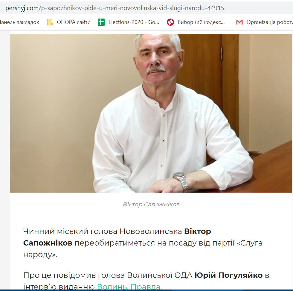 12 серпня на ресурсі «Правда. Волинь» вийшло інтерв’ю із очільником Волинської обласної держадміністрації Юрієм Погуляйком, котрий повідомив, що від партії «Слуга народу» на посаду очільника Нововолинська балотуватиметься чинний голова міста Віктор Сапожніков. Новини про це написали також видання «Перший», «ВолиньInfa», «БУГ», «Кордон», «Нововолинський інформаційний портал», інформаційне агентство «Конкурент».