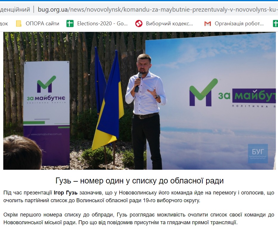 Чинний народний депутат Ігор Гузь під час презентації команди партії «За майбутнє» у Нововолинську та Володимирі-Волинському підтвердив, що очолить список партії в окрузі №19 на виборах до Волинської обласної ради. 16 серпня про це повідомило видання «БУГ».