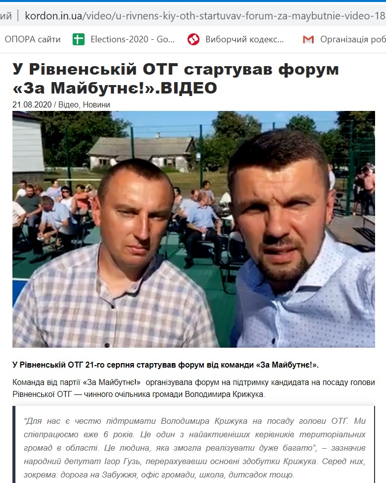 Також 21 серпня видання «Кордон» повідомило про старт форуму від партії «За майбутнє». У публікації йдеться, що захід влаштували на підтримку чинного голови Рівненської ОТГ Володимира Крижука, котрий балотуватиметься на відповідну посаду на виборах 25 жовтня.
