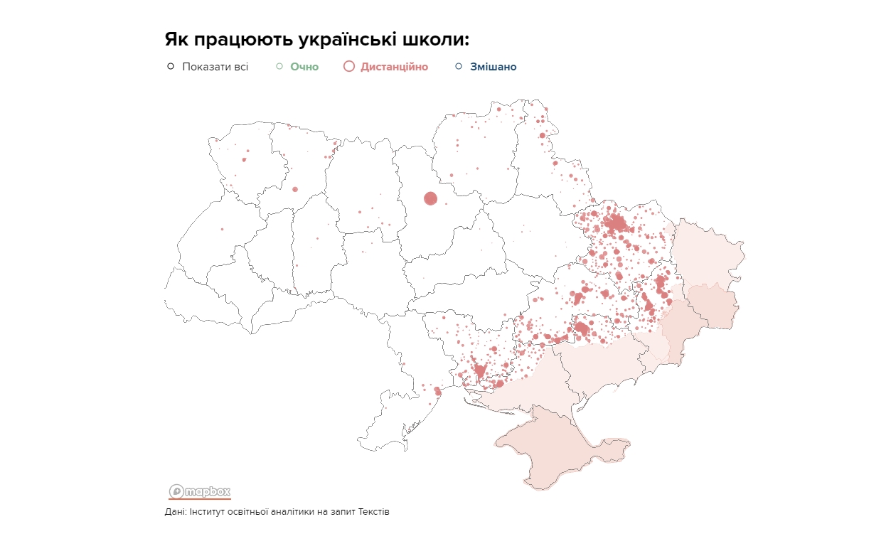 Видання «Тексти» створило інтерактивну мапу, на якій позначило школи, у яких навчання відбувається очно, дистанційно, або у змішаному форматі.