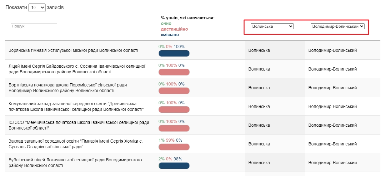 На окремій мапі також можна дослідити, як працюють школи у конкретному регіоні України. Школи можна фільтрувати за областю та районом, а також шукати за назвою.